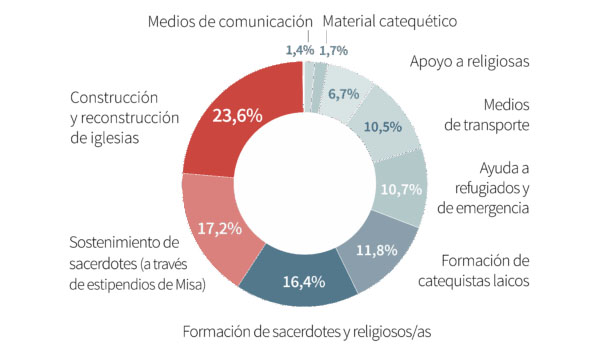 La generosidad de nuestros benefactores hace posible que financiemos cada año alrededor de 5 500 proyectos de carácter pastoral (sostenimiento y formación de sacerdotes y religiosos, formación de catequistas y laicos, construcción y reconstrucción de iglesias, vehículos y medios de comunicación para la evangelización, material catequético) y, excepcionalmente, ayuda de emergencia.
